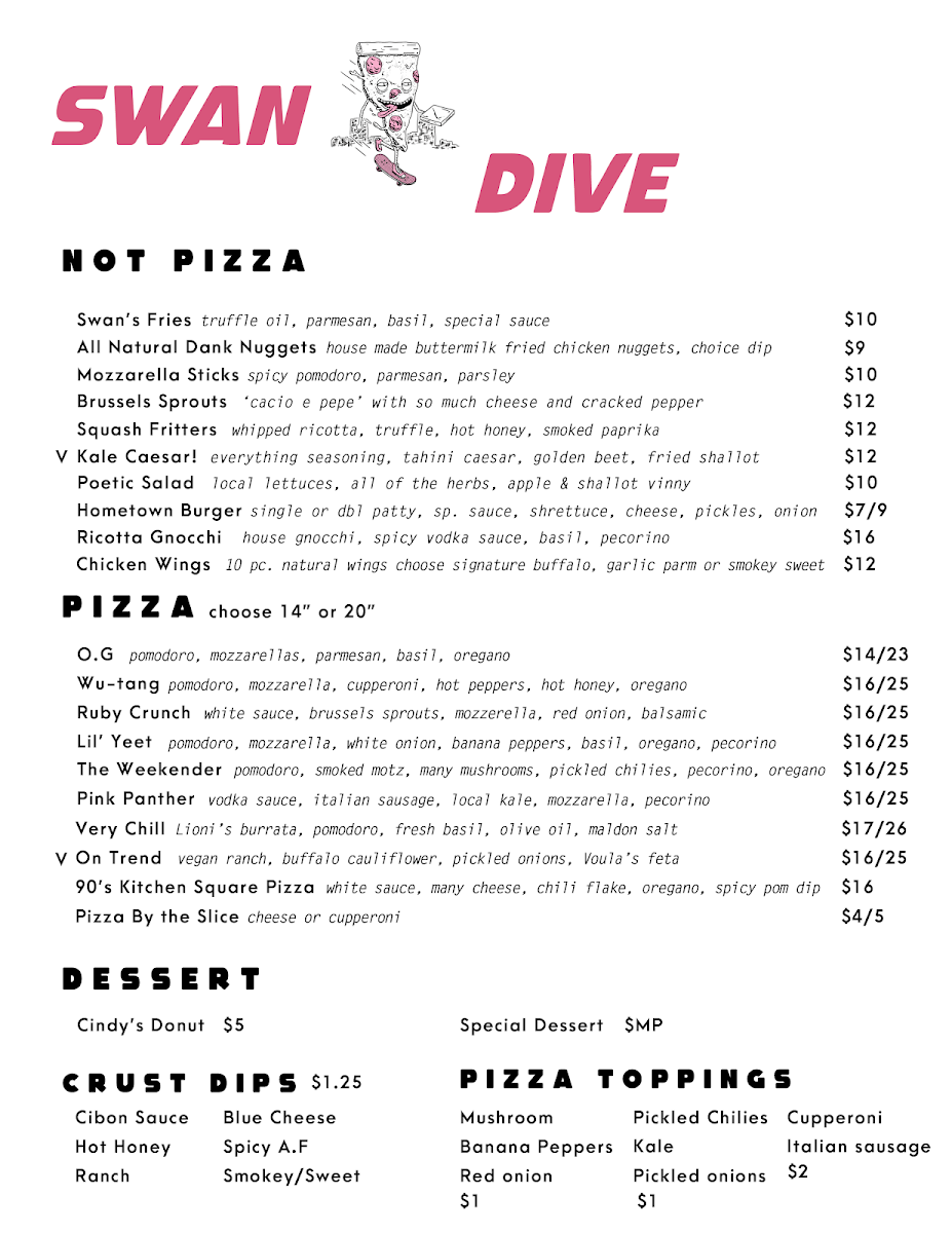Finish your meal with the heavenly Banana Pudding, rich with mascarpone whip, olive oil, and a touch of sea salt for just $10.00. Happy hour here is a necessity—sample the Kale Caesar Salad and indulge in large slices of pizza starting from $3.00. At Swan Dive, every bite is crafted with care, ensuring an unforgettable dining experience.
